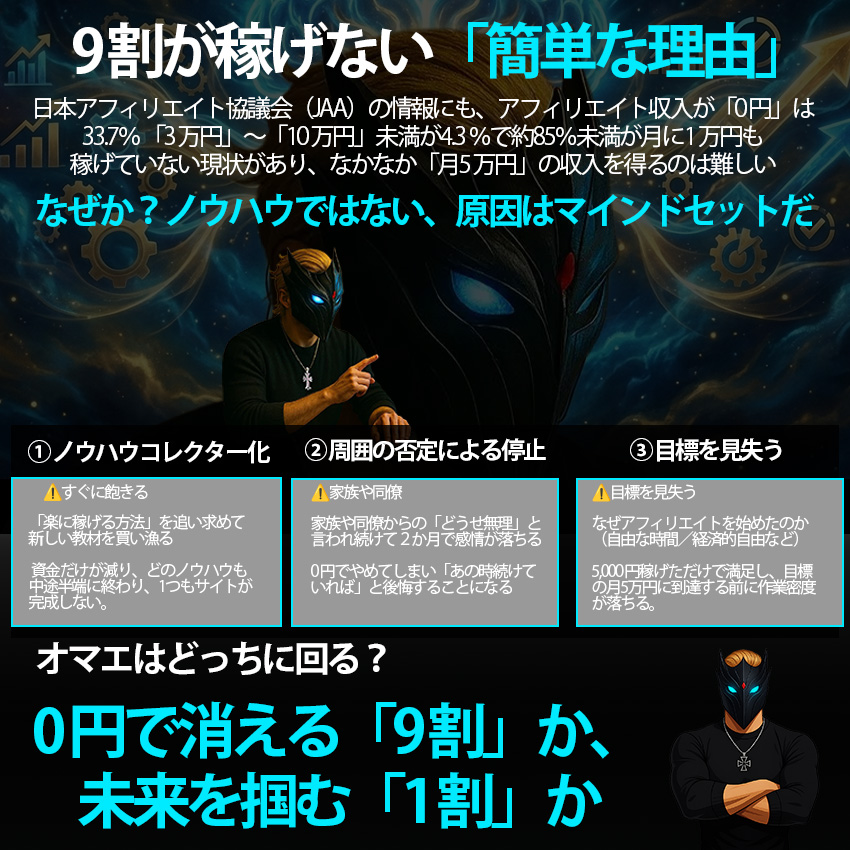 | ノウハウコレクター化 | 「楽に稼げる方法」を求め、次々と新しい商材を買い続ける。 | 【結末】 資金だけが減り、どのノウハウも中途半端に終わり、1つもサイトが完成しない。 |