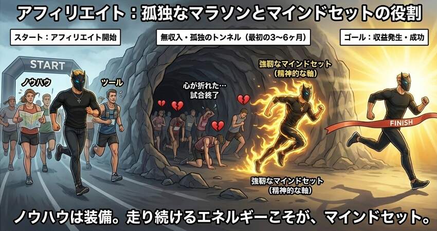 この「無収入の孤独なトンネル」を走り抜けるためには、強靭な精神的な軸が必要となってくる。この軸こそがマインドセット。どんなに優れたノウハウがあっても、心が折れたら作業はストップし、そこで試合終了。